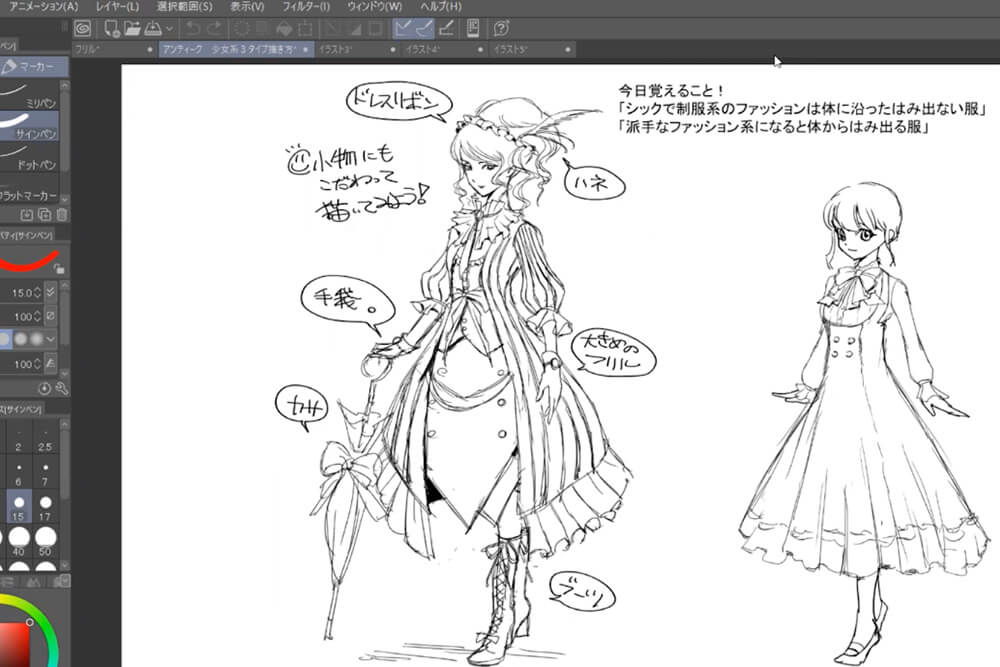 「顔の描き方」から「キャラクターデザイン」まで、イラストの基礎を丁寧に学べるコースです。